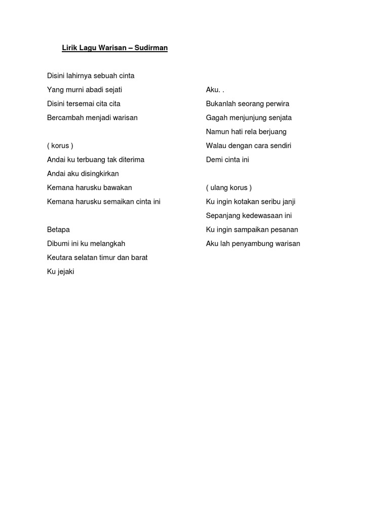 . Blog lirik lagu ini tidak menyediakan sebarang link untuk download lagu mp3 dari samada dalam format mp3 atau sebarang format audio yang lain. Warisan Disini lahirnya sebuah cinta Yang murni abadi sejati Disini tersemai cita cita Bercambah menjadi warisan korus Andai ku terbuang tak diterima Andai aku disingkirkan Kemana harusku bawakan Kemana harusku semaikan cinta ini Betapa. Untungnya kita tidak perlu bersusah payah untuk mendapatkan kemerdekaan seperti orang.